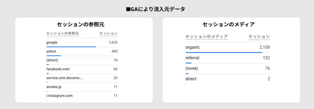 Google Analyticsでは、「訪問者がどこから来たか? = 流入元」を調べreることができます。「セッションの参照元/メディア」です。「参照元(sourse)」とは、「どのチャネルから来たか?」です。例えば「google」「yahoo」「facebook」などの媒体で、「メディア(medium)が 「どのように来たか?」で、「organic(自然検索)」「referral(外部からの直接流入)」「cpc(広告流入)」などがあります。