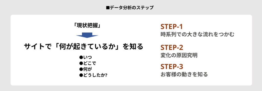 現状把握のためのデータ分析の基本は、大きな流れで変化点を見つけ、細かく見て原因を探る流れです。分析ステップとしては次の3ステップです。