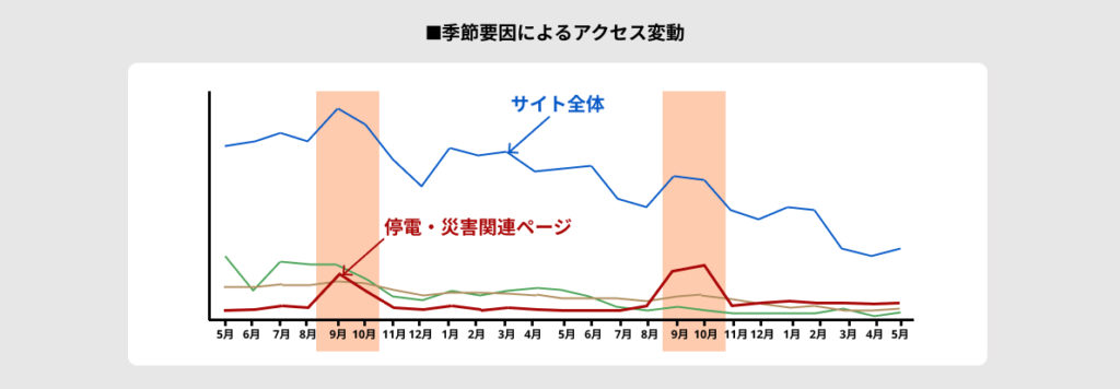 一つ目の事例は、増加原因がページ別で細分化して見て判明したという事例です。商品は太陽光発電システムで、サイト全体見ると2年連続で9月ごろだけ増加していました。全体で見ているとその原因がわからなかったのですが、ページ別の推移を見ると、「停電・災害」に関するページが伸びていたのです。つまり、そのころは2年連続で9月に豪雨被害が起こっており、その対応でアクセスが伸びていたのだと思われます。このように、9月の豪雨という外的要因によってお客様の突発的なニーズが強まり、サイトのアクセスが伸びていたという事例でした。